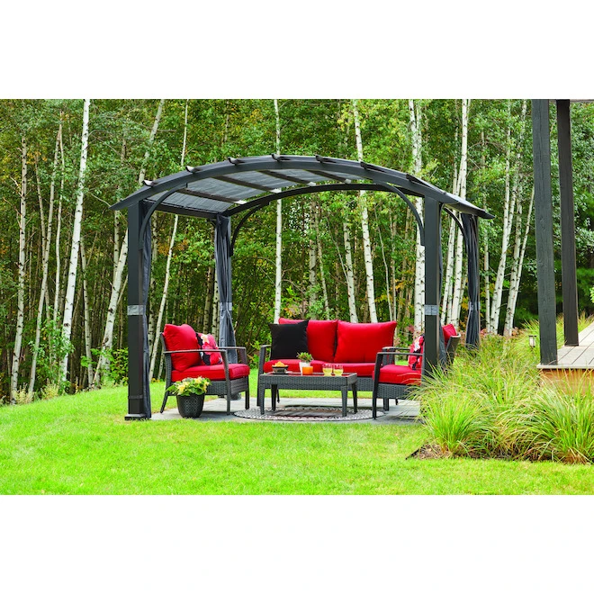 Add a touch of originality to your yard with this beautiful pergola, which features a heavy-duty steel frame with a powder-coated finish that’s designed to stand up against the elements, ensuring you’ll be able to use it for years to come. The grey arched sling canopy boasts a unique design that creates the illusion of more interior space, while individual side curtains are easy to open or close, depending on your preferred level of shade and privacy. The top canopy is easy to remove; simply unscrew the knob-ended bolt at each corner. This pergola is backed by a 1-year limited warranty to give you peace of mind.