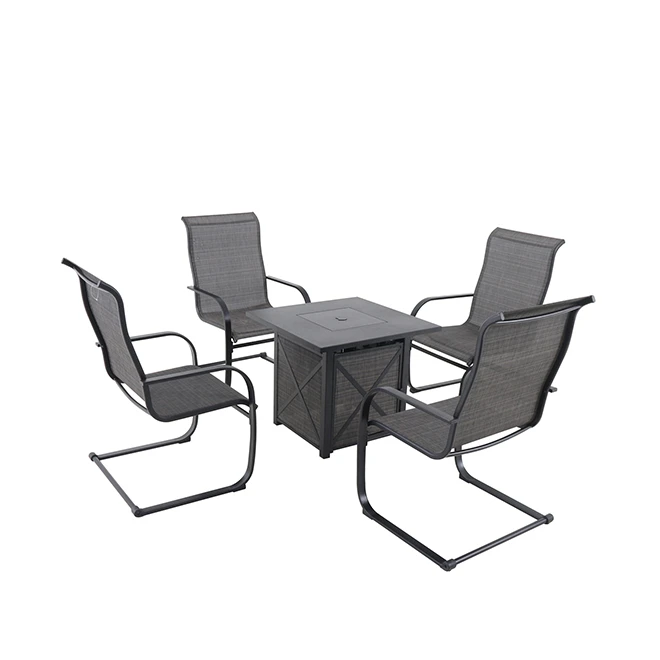 Create the perfect place to entertainment outside with this Hartford 5-piece patio set by Style Selections. Made of steel, it includes four chairs with fast-drying sling fabric and a gas fire table. The fireplace has a thermocouple safety feature that shuts off the gas flow if the flame goes out and also includes decorative lava rocks and a PVC protective cover. The gas tank is sold separately.