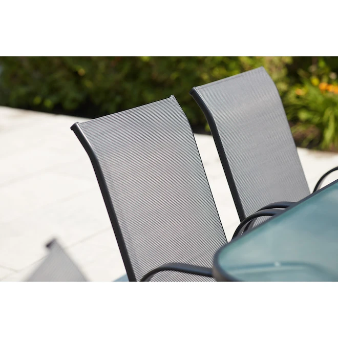 - Grey easy-care sling fabric effortlessly blends in with any style of outdoor style